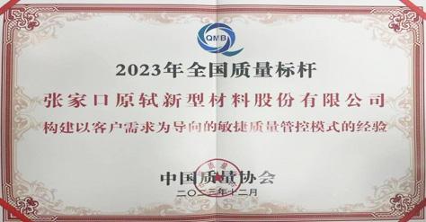 2023年12月,張家口原軾新型材料股份有限公司憑借 “構(gòu)建以客戶需求為導(dǎo)向的敏捷質(zhì)量管控模式的經(jīng)驗(yàn)”,榮獲2023年全國(guó)質(zhì)量標(biāo)桿企業(yè)。